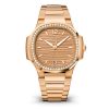 The 32 mm Patek Philippe Ladies Nautilus Watch Style No. 7118/1200R-010 features an exquisite 18K rose gold case adorned with 46 diamonds (approximately 0.73 ct. ), a golden dial with luminescent applied gold hour markers, a quartz caliber E23-250 S C movement with date and sweep seconds, an 18K rose gold bracelet, and a Nautilus fold-over buckle. The watch is a 60 m water resistance.